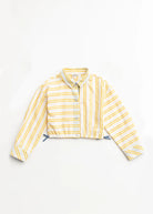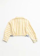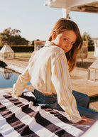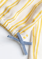 The Backyard Button-Up in lightweight cotton has a slightly cropped length, an elastic hem with tacked bows, and contrast chambray fabric at the cuffs. It’s the ideal style to wear to all your outdoor occasions. The sunny striped fabric is thoughtfully mixed in different directions, adding extra interest to an otherwise classic silhouette.